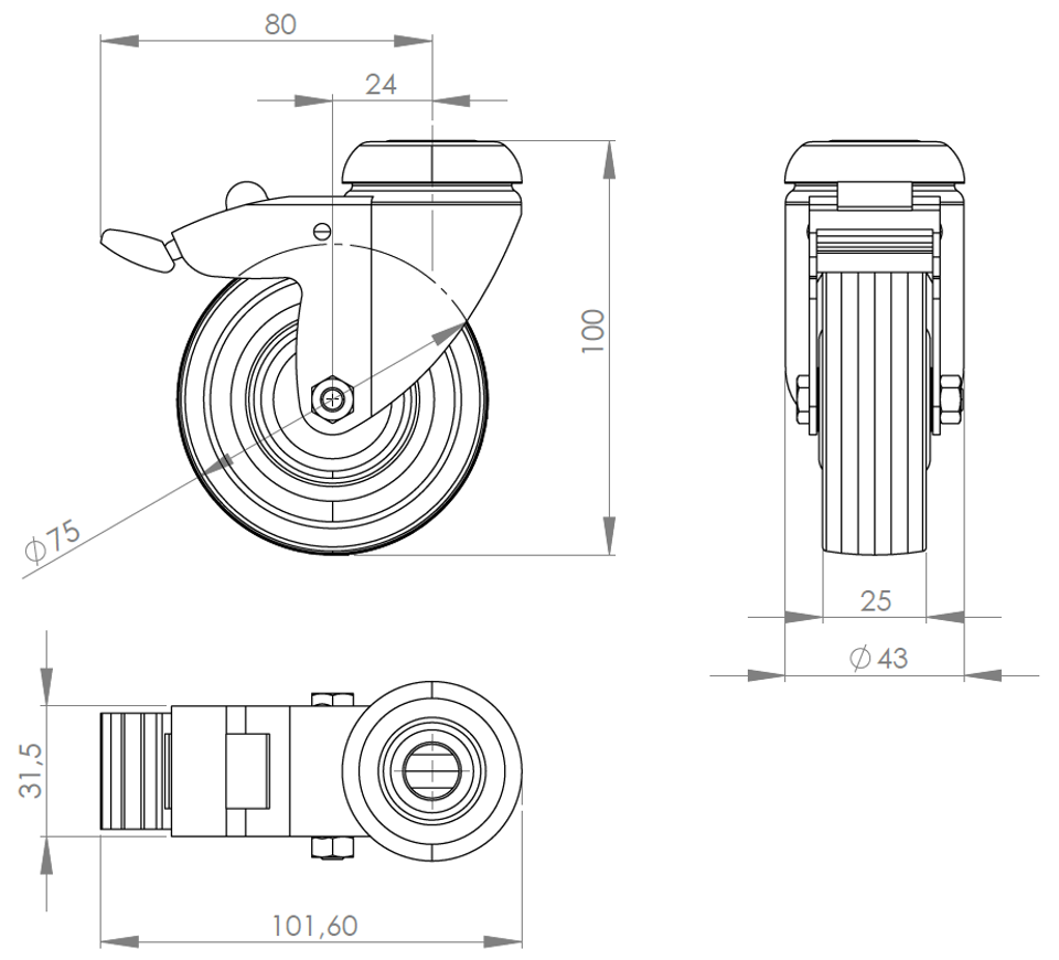 ROLKA SKRĘTNA D75 Z HAMULCEM (Z OTWOREM NA ŚRUBĘ D13) ENG