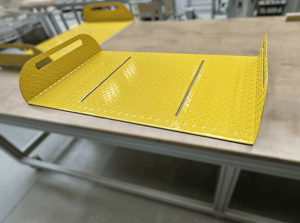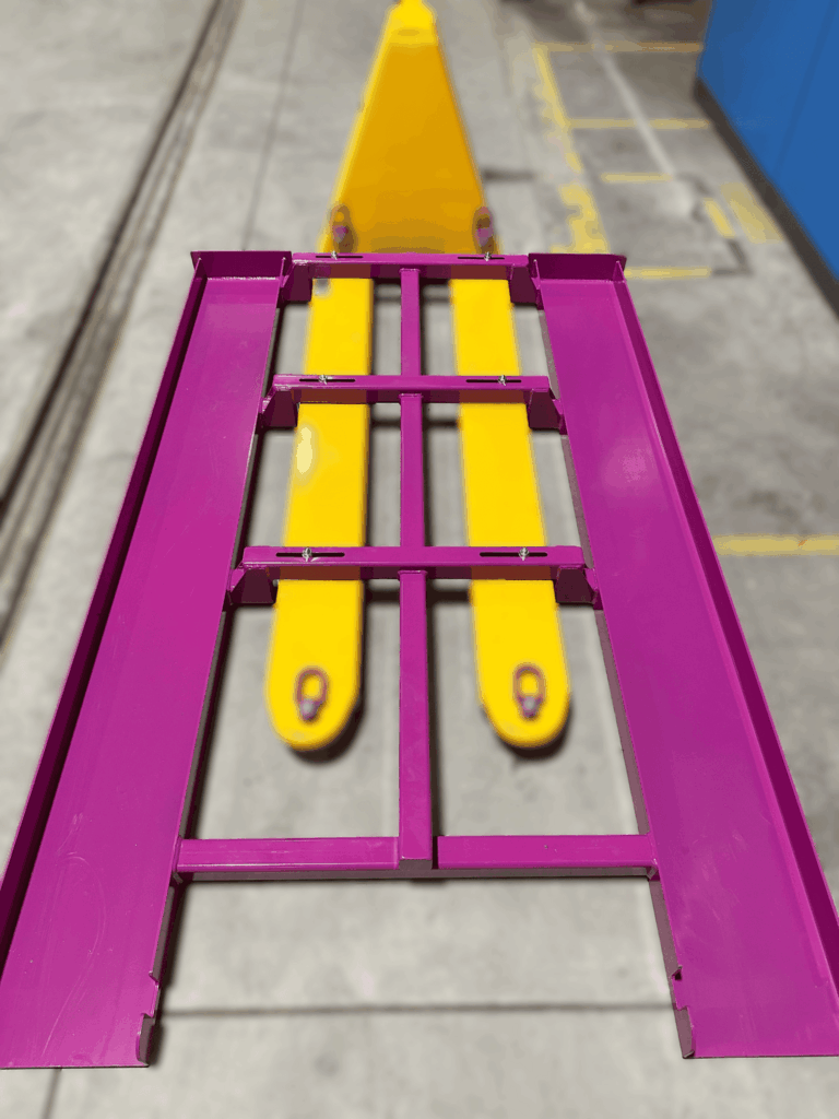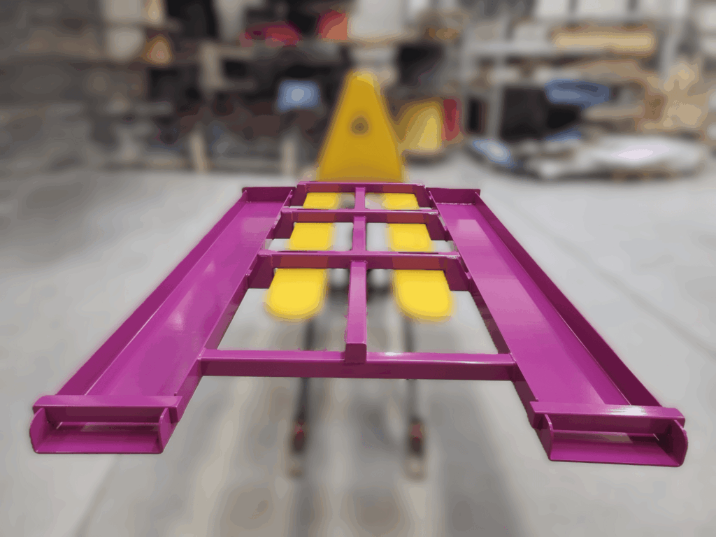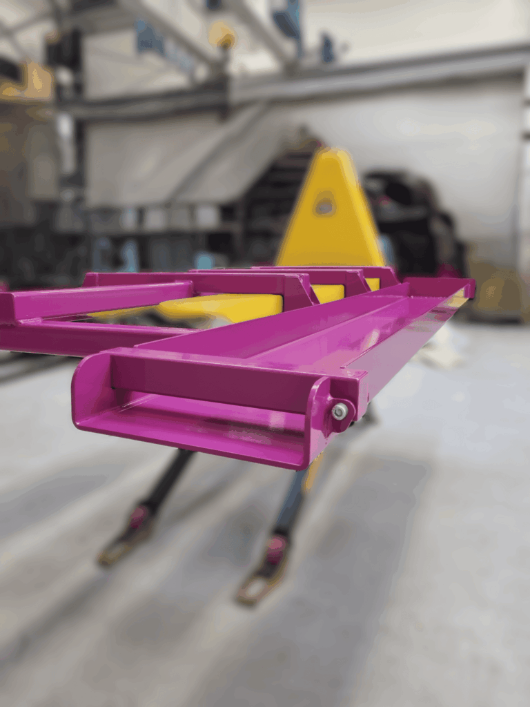 Przykładowo, stalowe przeciwwagi oraz uchwyty transportowe pomalowaliśmy na magentę, natomiast podesty zgodnie ze specyfikacją musiały być żółte.